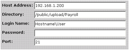 Send File Via FTP – Use this feature to automatically transfer the file via FTP (File Transfer Protocol) to a destination of your choice. A set of related fields will become available and must be filled out. Configuration examples are shown below. Keep the items that follow in mind when entering this information.