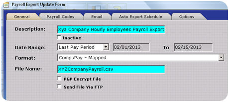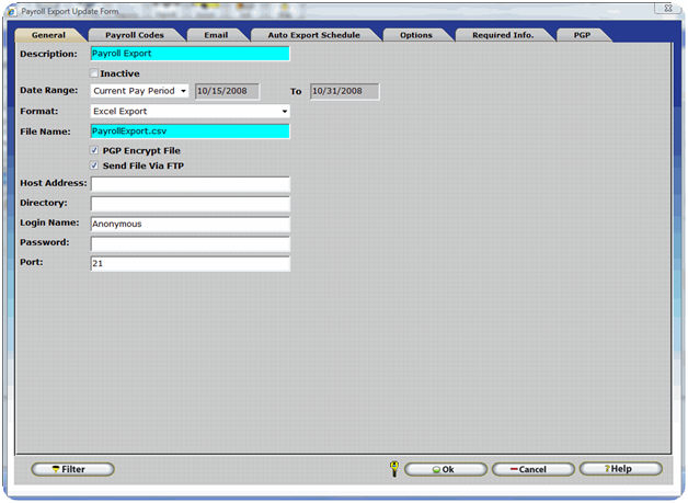 The General Tab of the Payroll Export Update Form includes General and Output related options. General Options include the Payroll Export Description, Payroll Export Date Range, Payroll Export Employee Filter, and Payroll Export Format which define the payroll export and control the date range and set of employees for which hours and earnings will be exported. Output Options on the General Tab include the Payroll Export File Name, Send File via FTP, and PGP Encrypt File which control how the final Payroll export is distributed to interested parties such as internal staff or a third party company which will process payroll for your organization.