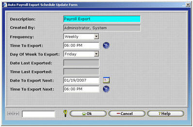 Payroll Exports can be automatically exported a single time on a specific date and time or according to preset intervals such as Daily, Weekly, or Monthly. Payroll Export files with Auto Schedules will be exported based upon Output Settings as follows: