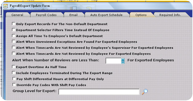 The Payroll Export includes four options which alert the user of specific conditions before Employee Hours and Earnings are exported to the Final Payroll Export File.