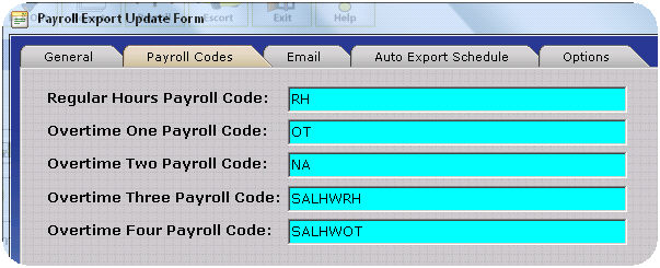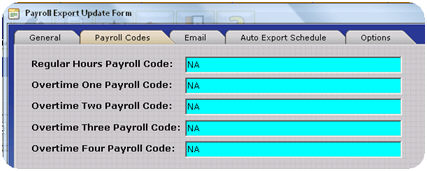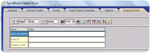 The Payroll Export Update Form displays Payroll Export related options and settings. Required settings have a blue background and must be completed before the Payroll Export can be saved.