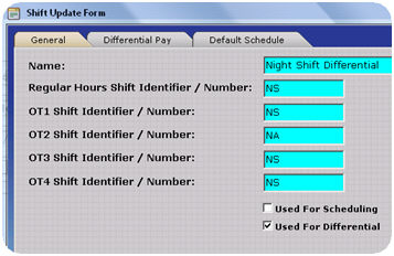 Shift Identifiers must be set on the General Tab of the Shift Update Form. One shift should be created for each Shift Differential.