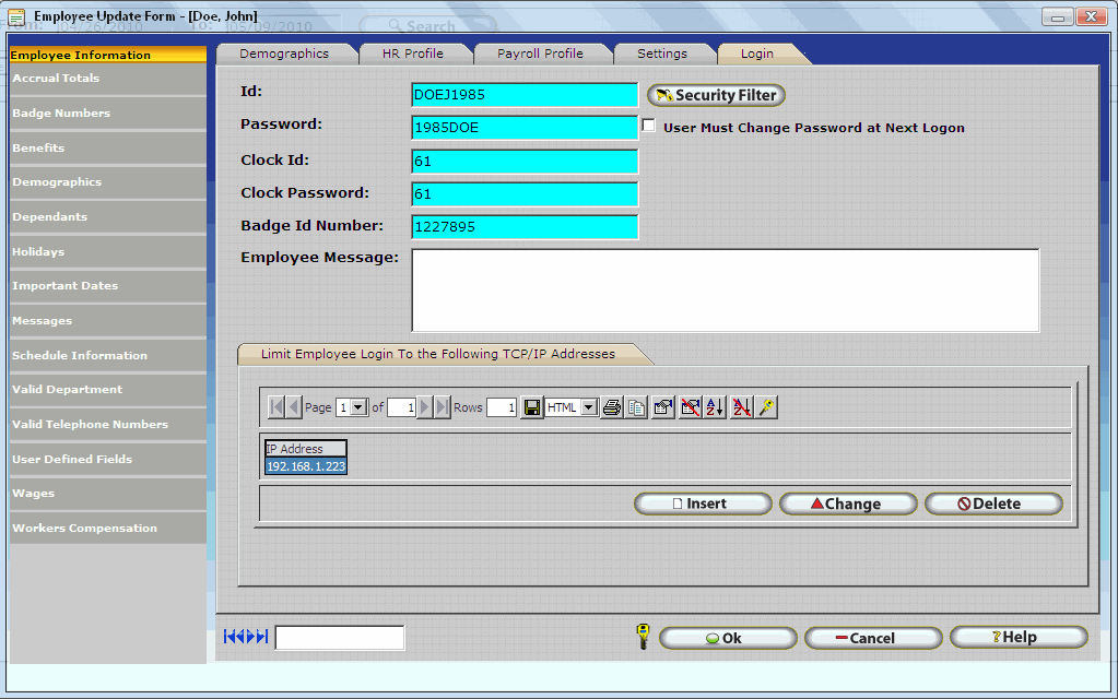 Limit Employee Login to the Following TCP/IP Addresses: In this section you can enter different TCP/IP Addresses of computers this specific employee can access the software you can read more about the valid IP addresses in chapter two.